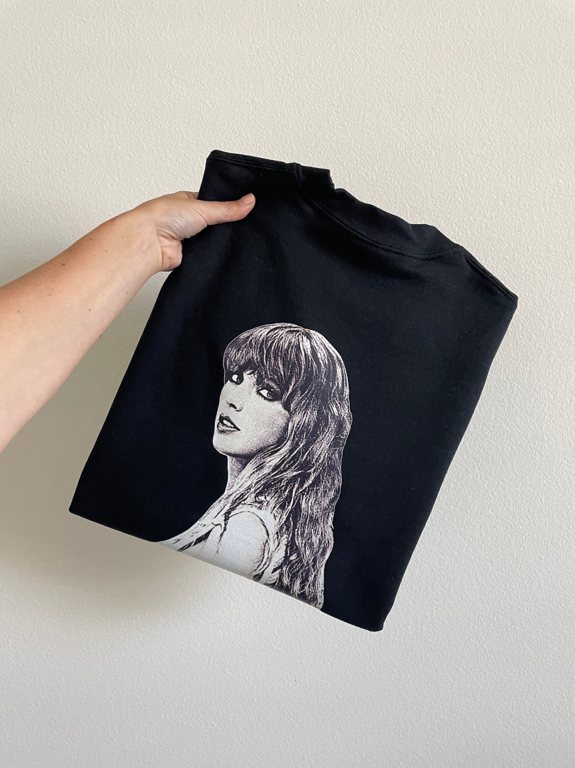 Black Crewneck. Large Taylor Swift photo on the back. With vinyl sleeves “The Eras Tour” , “Taylor Swift”.